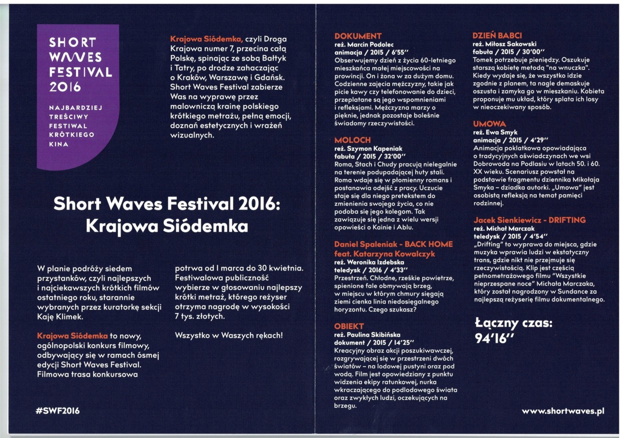 "Krajowa siódemka, czyli Droga Krajowa numer 7, przecina całą Polskę, spinając ze sobą Bałtyk i Tatry, po drodze zahaczając o Kraków, Warszawę i Gdańsk. Short Waves Festival zabierze Was na wyprawę przez malowniczą krainę polskiego krótkiego metrażu, pełną emocji, doznań estetycznych i wrażeń wizualnych. W planie podróży siedem przystanków, czyli najlepszych i najciekawszych krótkich filmów ostatniego roku, starannie wybranych przez kuratorkę sekcji Kaję Klimek” — polecają organizatorzy.