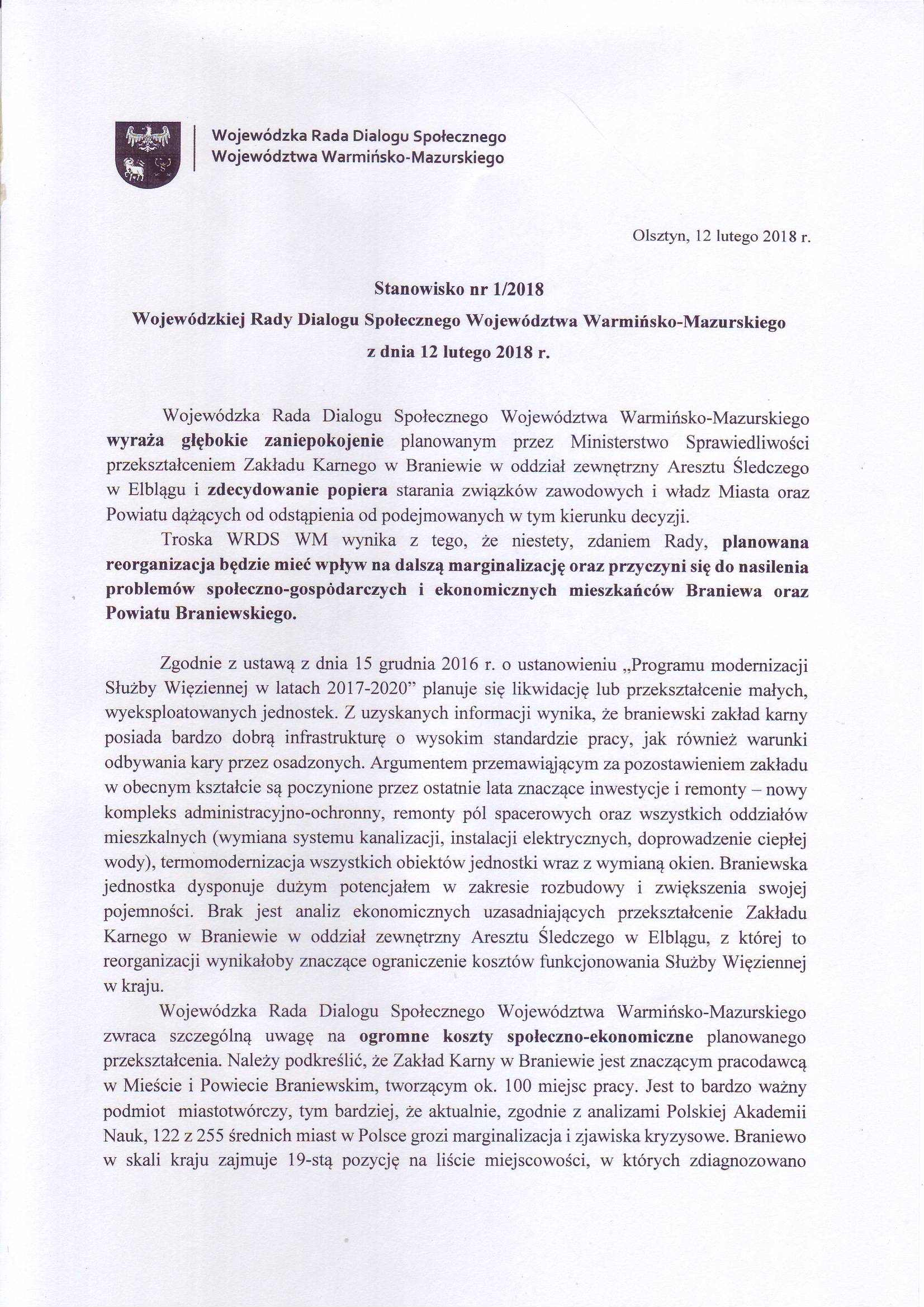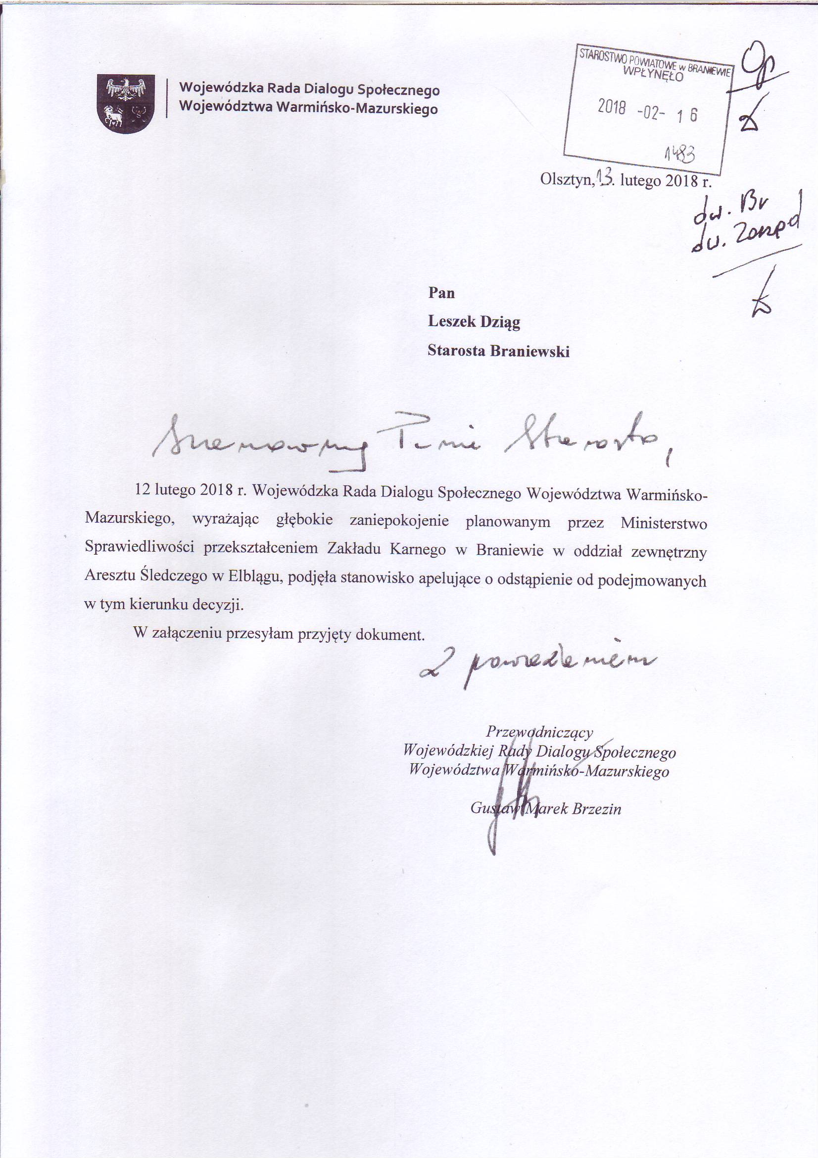 „Wojewódzka Rada Dialogu Społecznego Województwa Warmińsko-Mazurskiego, wyrażając głębokie zaniepokojenie planowanym przez Ministerstwo Sprawiedliwości przekształceniem Zakładu Karnego w Braniewie w oddział zewnętrzny Aresztu Śledczego w Elblągu, podjęła stanowisko apelujące o odstąpienie od podejmowanych w tym kierunku decyzji” — napisał w piśmie do starosty braniewskiego Leszka Dziąga marszałek województwa Gustaw Marek Brzezin.