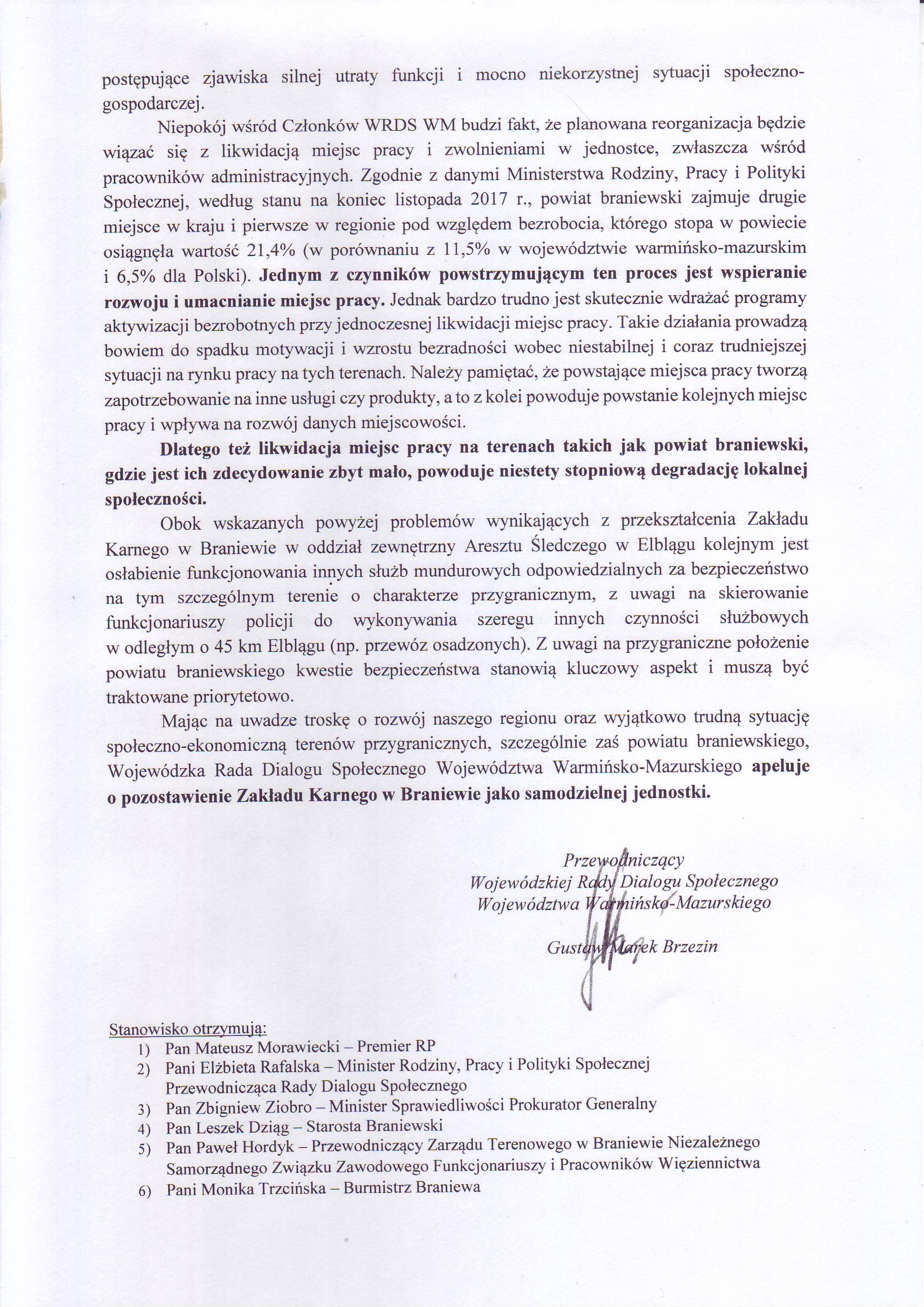 — Mając na uwadze troskę o rozwój naszego regionu oraz wyjątkowo trudną sytuację społeczno-ekonomiczną terenów przygranicznych, szczególnie zaś powiatu braniewskiego, Rada apeluje o pozostawienie Zakładu Karnego w Braniewie jako samodzielnej jednostki — stwierdza marszałek województwa Gustaw Marek Brzezin.